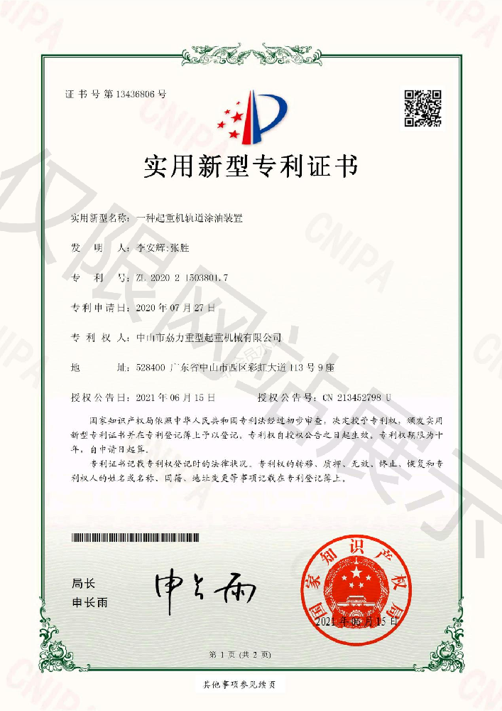 實用新型專利證書 -- 起重機軌道涂油裝置