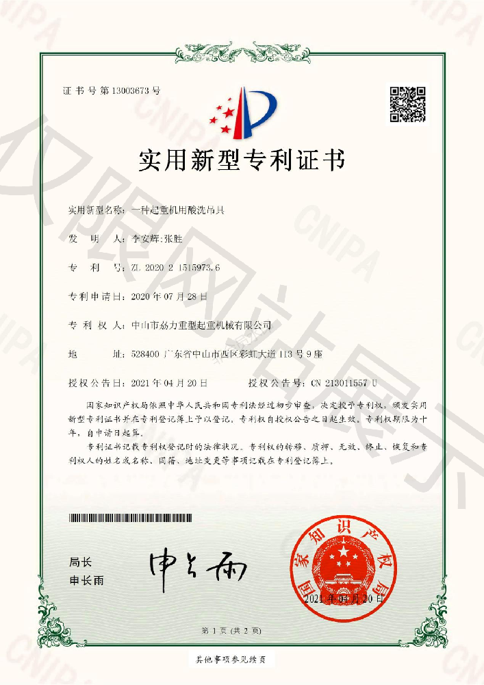 實用新型專利證書 -- 起重機用酸洗吊具