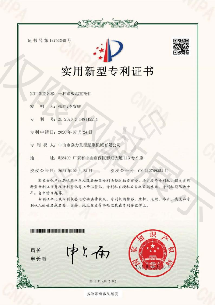 實用新型專利證書 -- 鋼板起重托件