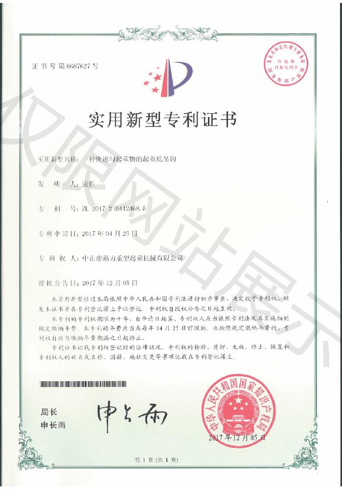 實用新型專利證書 -- 起重機用羊角吊鉤